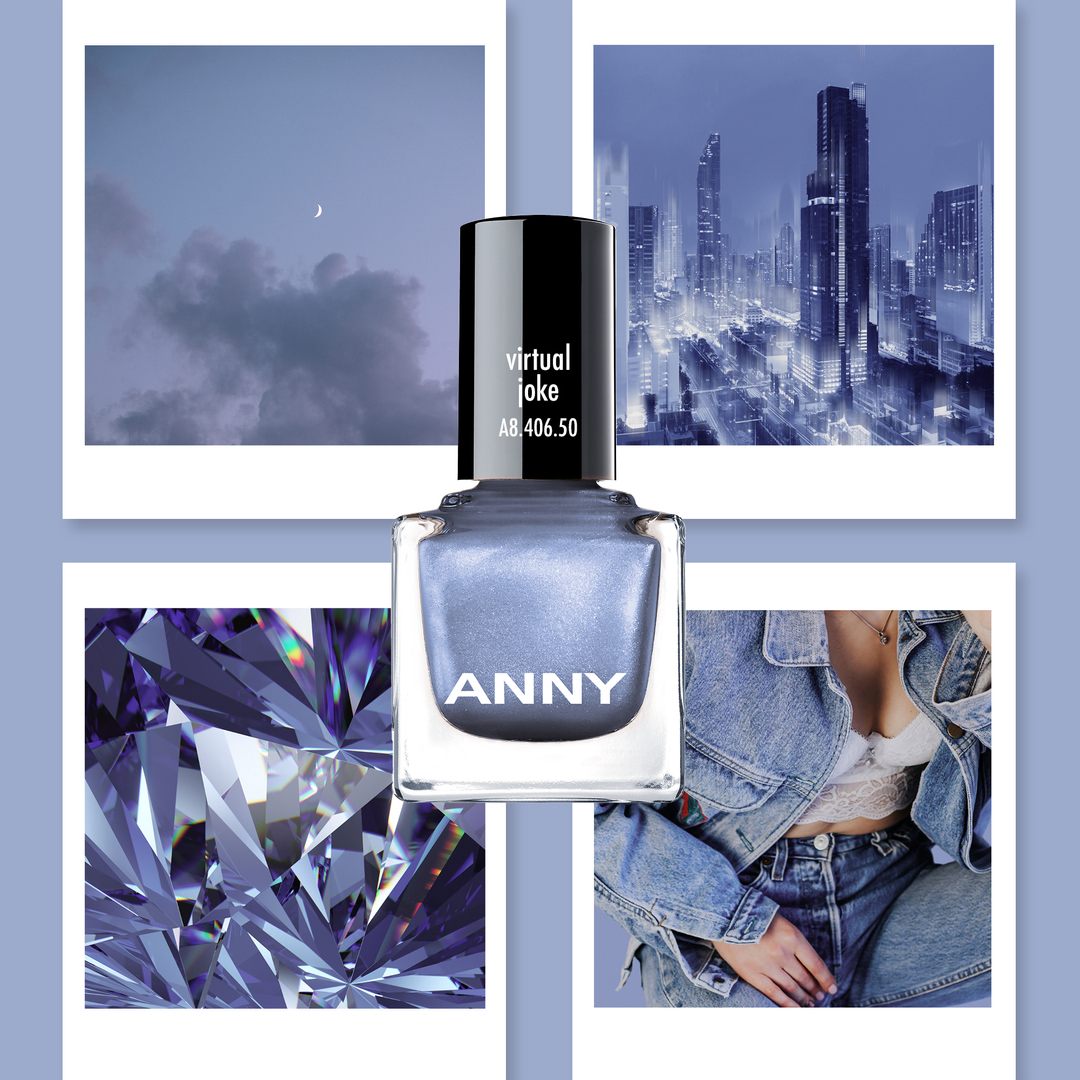 以丹寧布藍色為基底,融合清新愛麗絲藍,偏光下透出微妙靛色,疊擦兩層後轉變為鋼筋藍的視覺漸變感,是都市感十足的金屬藍色。
