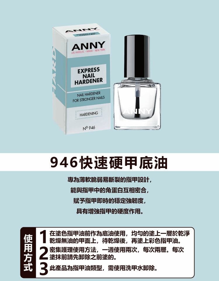 用途:ANNY專門開發,用於脆弱易斷裂的指甲。賦予指甲穩定和強度。與天然存在於指甲中的角蛋白相結合,具有增強指甲的作用。