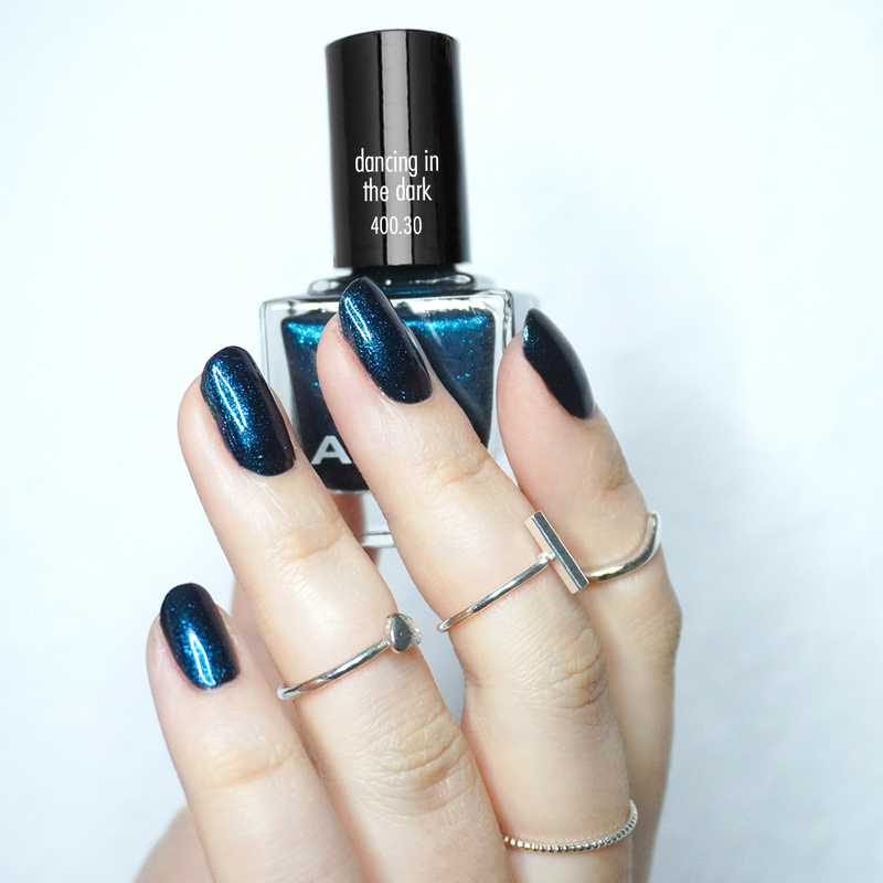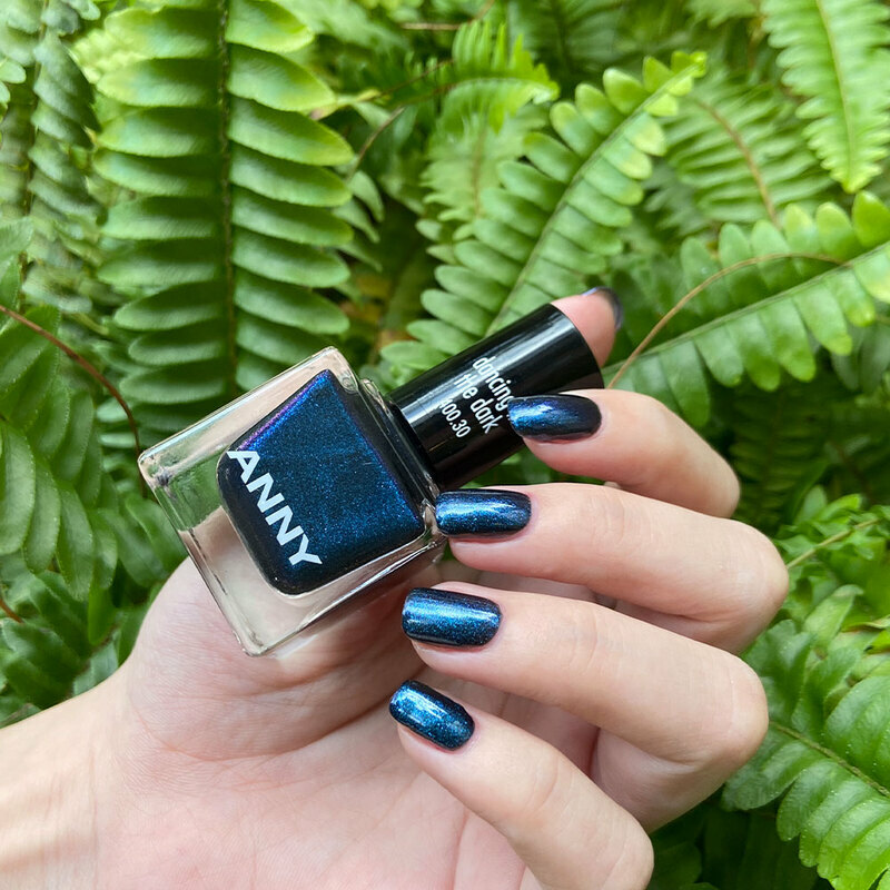 日暮時分的愛琴海深藍,糝入大量的藍色,和少許的紫色細閃。薄塗一層呈現透潤感的晶礦水墨藍,堆疊兩層後,是濃郁飽和的偏光深海藍,層次感十足!