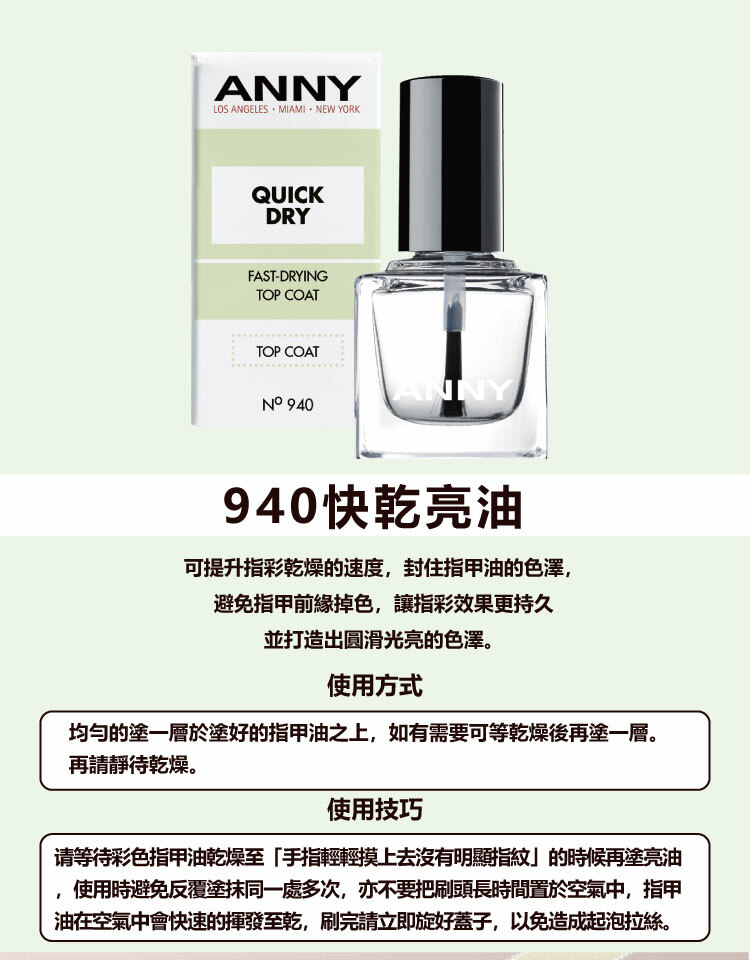使用方法:在半乾燥的指彩上,平均薄擦一層,同透明指甲油使用,每次使用可擦一到二層。雖然可使指甲油快速乾燥,仍需避免用力碰撞。