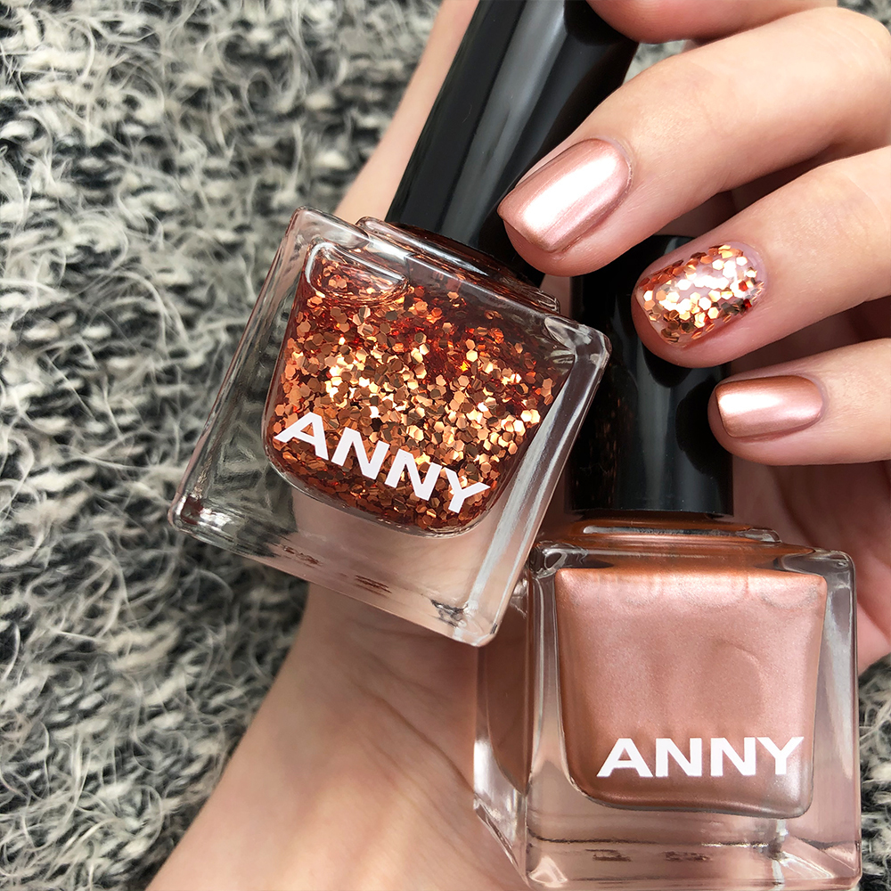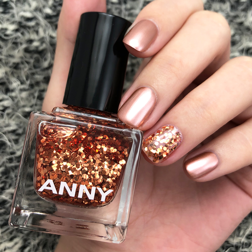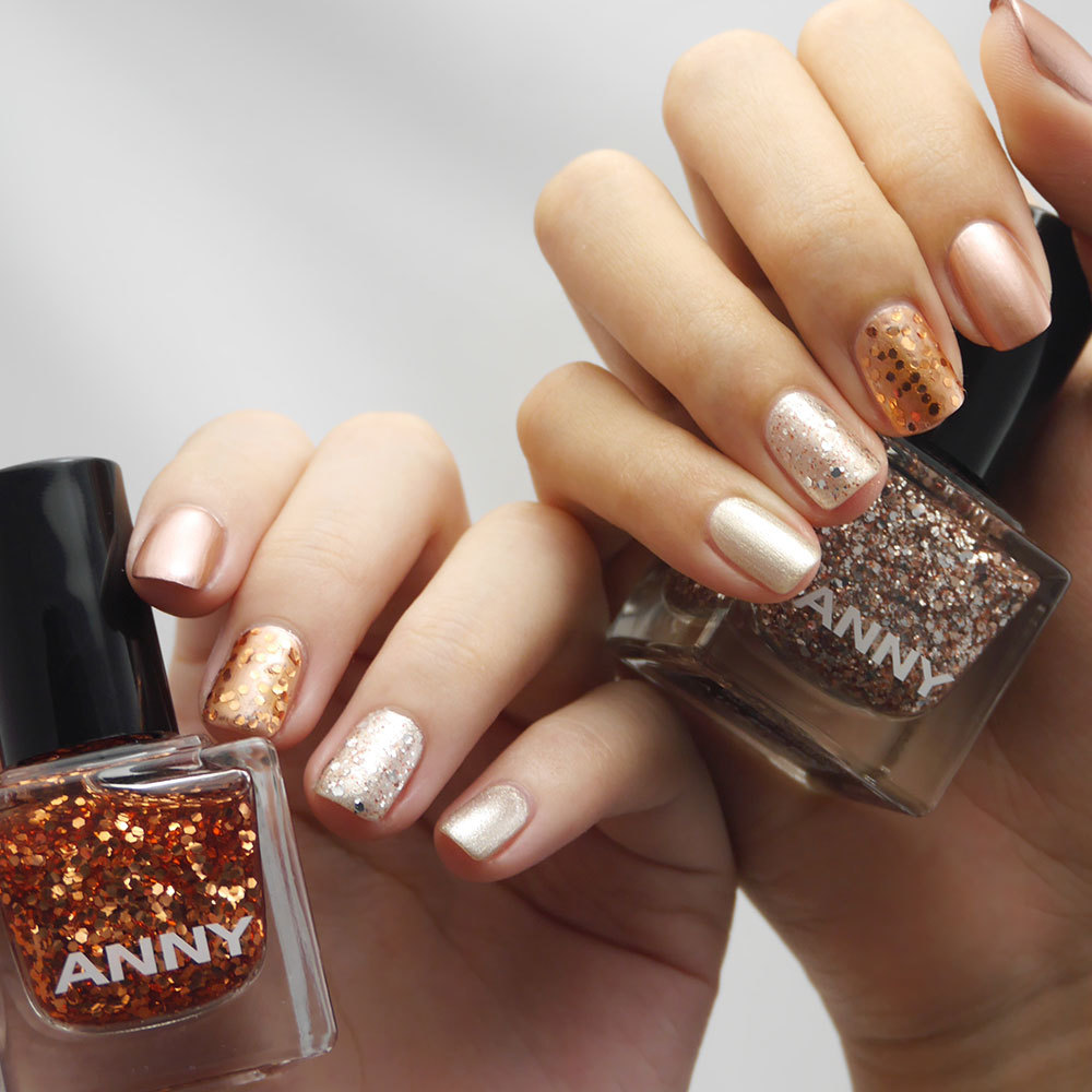 搶眼的古銅色亮片搭配清澈、流平度高的透明底油,更可以顯現古銅亮片的質感,擺動間折射出如同燭光般明滅不定的效果。