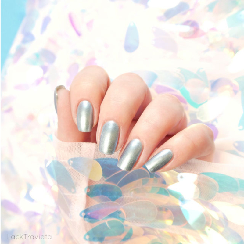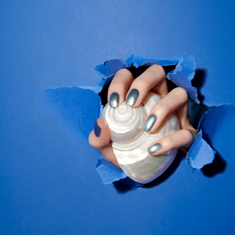 藍綠貝殼色混入一點灰,帶有極細緻七彩珠光,是人魚留下的眼淚,在太陽底下折射度更高