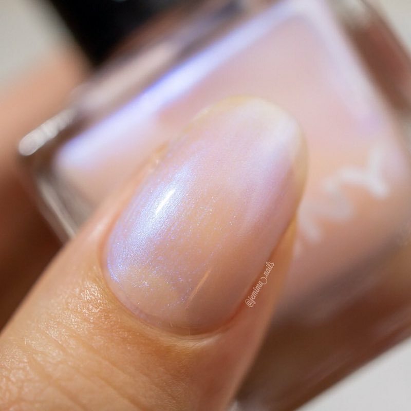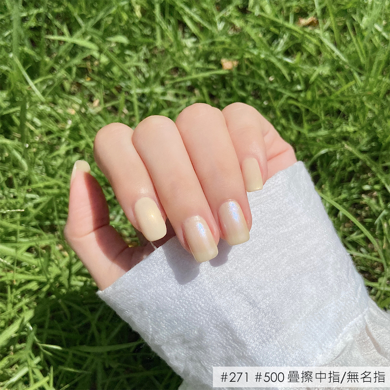 透明粉膚色的基調,陽光下薄透出貝殼光,與其他指彩疊擦就是最火紅的人魚姬色